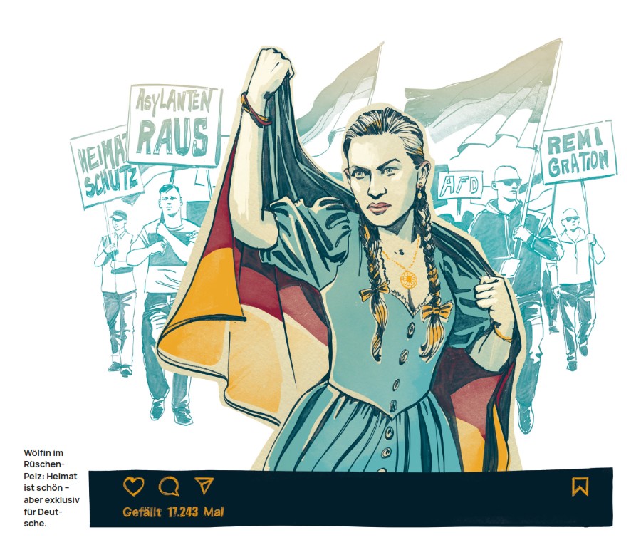 Der Instagram-Post zeigt eine junge Frau im Trachten-Dirndl: „Heimatliebe ist tragbar“. Sie bekommt dafür 1.604 Likes. Mode-Content? Von wegen: Schon beim zweiten Kommentar geht es national zur Sache: „Ihr seid tolle deutsche Mädels. Es freut mich […] mit welchem Ehrgeiz ihr euch für unsere Heimat, ungeborenes Leben und für das echte Feminine einsetzt.“ Neben den Hashtags #heimatliebe und #dirndl steht #lukreta. Der Account dahinter nennt sich „Unabhängige Initiative junger Frauen“. Eines seiner Ziele ist: „Ausländer raus!“